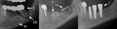 Die Röntgenbilder zeigen einen Kieferaufbau eines durch Zahnentzündung (Z) entstandenen Knochendefekts (KD) in Nervnähe (N). Die Transplantate (T) aus dem Kieferwinkel wurden mit kleinen Schrauben fixiert. Nach Heilung erfolgt die weitere Implantatversorgung (I).