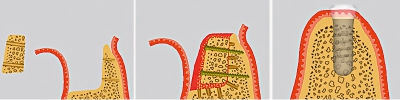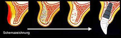 Fehlender Knochen wird an anderer Stelle im Kiefer entnommen und mittels Schrauben an der Implantationsstelle befestigt, und nach der Einheilung ein Implantat eingebracht.