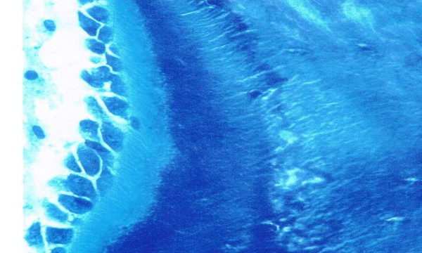 Osteoblasten (li.) produzieren eine feste Matrix (Osteoid re.)